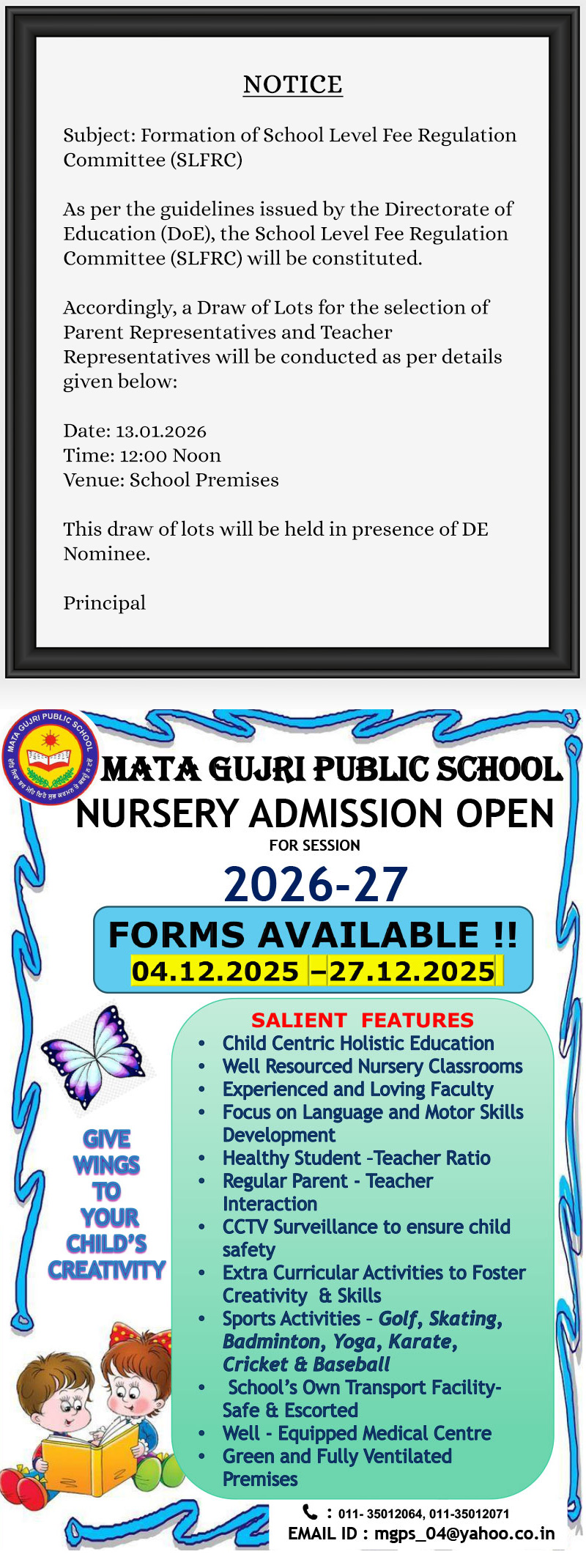 Call for Nursery Admission Enquiry : 011-35012064/71